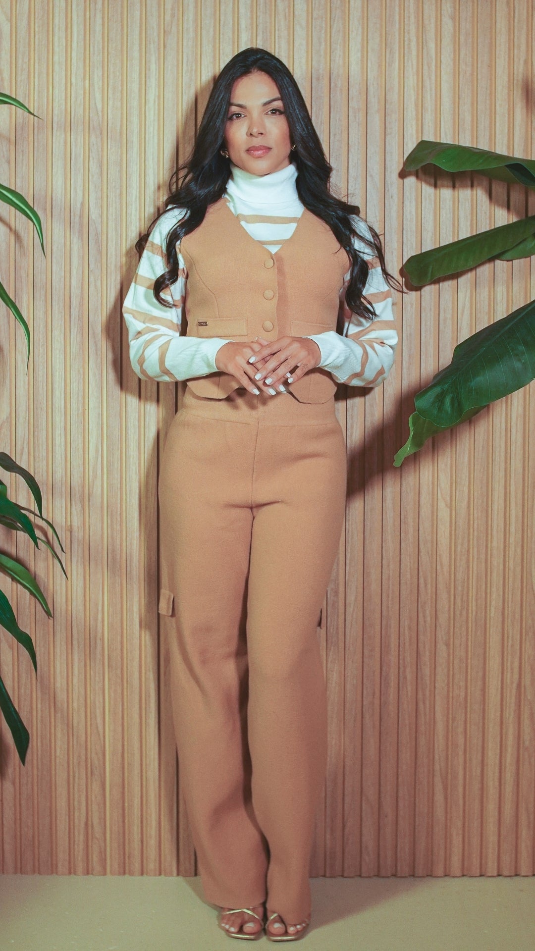 This two-piece set pairs a tailored vest-inspired top with full-length pants, crafted in a soft polyester blend with viscose and elastane for the perfect balance of structure, stretch, and comfort.