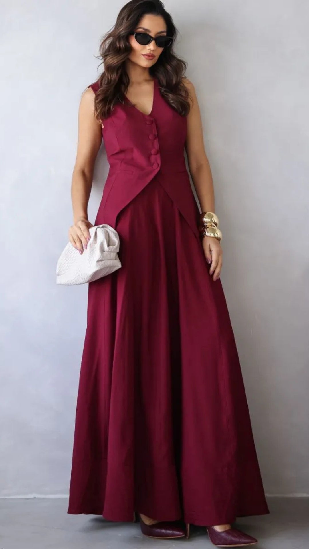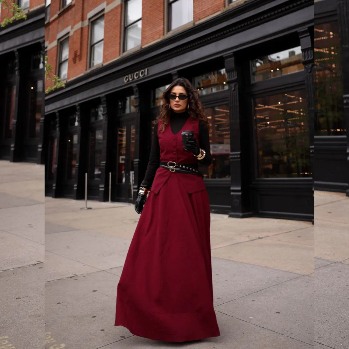 The Soho City Set is a refined expression of modern urban elegance. Designed with a fluid long skirt and a tailored button-front vest, this ensemble delivers a polished silhouette with effortless sophistication.