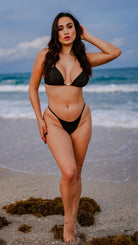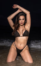 Elevate your beachwear with this luxurious black bikini set, designed to make a statement while flattering your silhouette. The triangle top sparkles subtly with shimmering accents, offering a glamorous touch without compromising elegance. Its structured fit naturally enhances the bust, while the matching bottoms hug the body like a second skin, accentuating curves with sophistication.